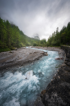 The Wimbach river originates in the Wimbach Valley in Ramsau near Berchtesgaden, a high valley in the middle of the Berchtesgaden Alps. More precisely, the water of the Wimbach rises in the Wimbachgries, a debris flow of dolomite rock that has formed in the valley. The Wimbachklamm, a gorge carved out of the rock by the Wimbach, is a popular destination at the entrance to the valley. A great place to hike and photograph.