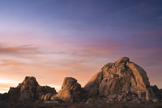 The last of the light bouncing off rock formations in Joshua Tree National Park after a brilliant sunset