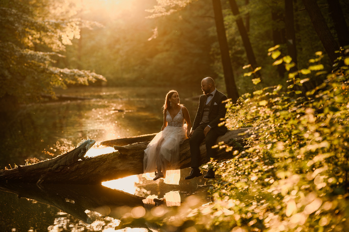 This post-wedding session was captured during the golden hour at a secluded wild pond. The setting sun provided a natural backlight, wrapping the couple in warm tones and enhancing the reflections on the water’s surface. The combination of natural light, untouched scenery, and intimate posing created an image that feels both timeless and atmospheric.