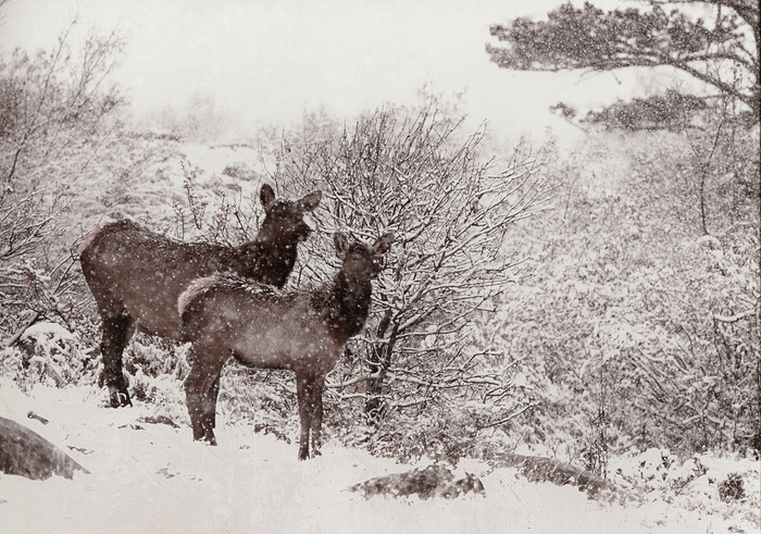 I don't make wildlife photographs often, but sometimes the opportunity just presents itself, like here. I was in Colorado with some friends who like to do wild life photography... I was, of course, they to do landscape work, and the two are not incompatible. It was icy cold and snowing when this cow elk and her baby, probably a yearling calf since it was way before calving season and this obviously isn't a newborn, wobbly legged baby. They just stood there, in nearly a perfect pose. How could I resist? I used a Canon F-1 camera and a 200mm f-2.8 lens and Kodak Ektachrome E-100S film with a UV 15 filter on the lens.