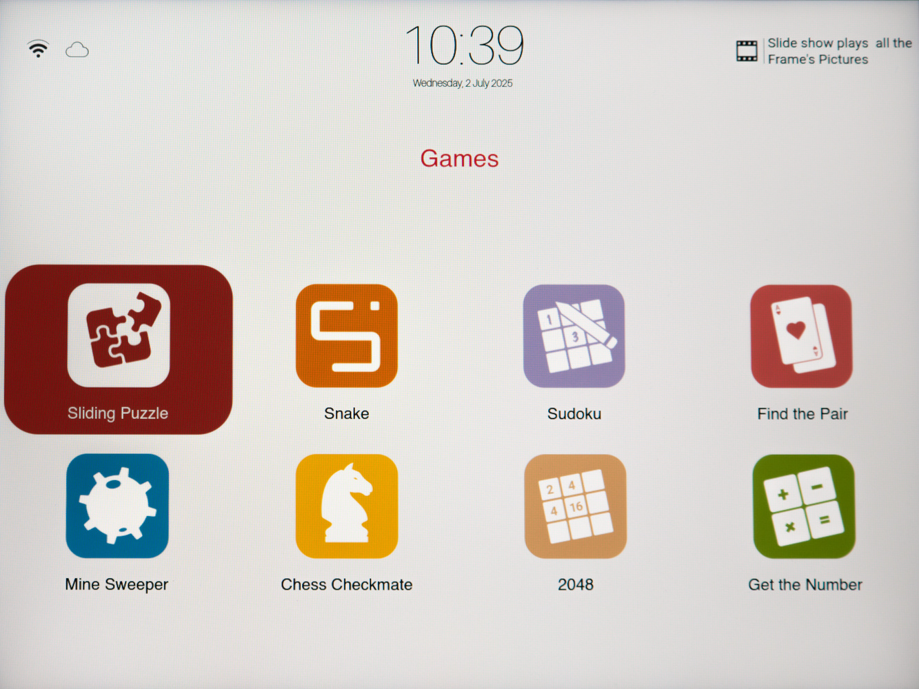 The frame has eight simple games to keep the mind active, including Sudoku, Minesweeper, and Chess Checkmate.