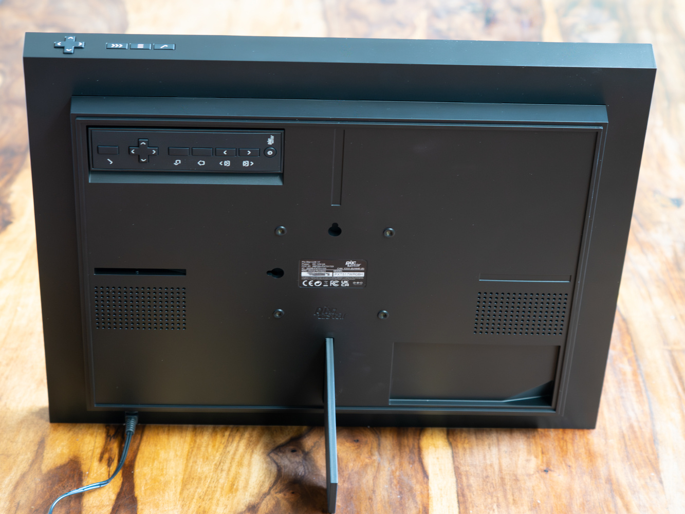 The rear of the Pix-Star 17" frame. The area bottom right magnetically stores the removable foot.