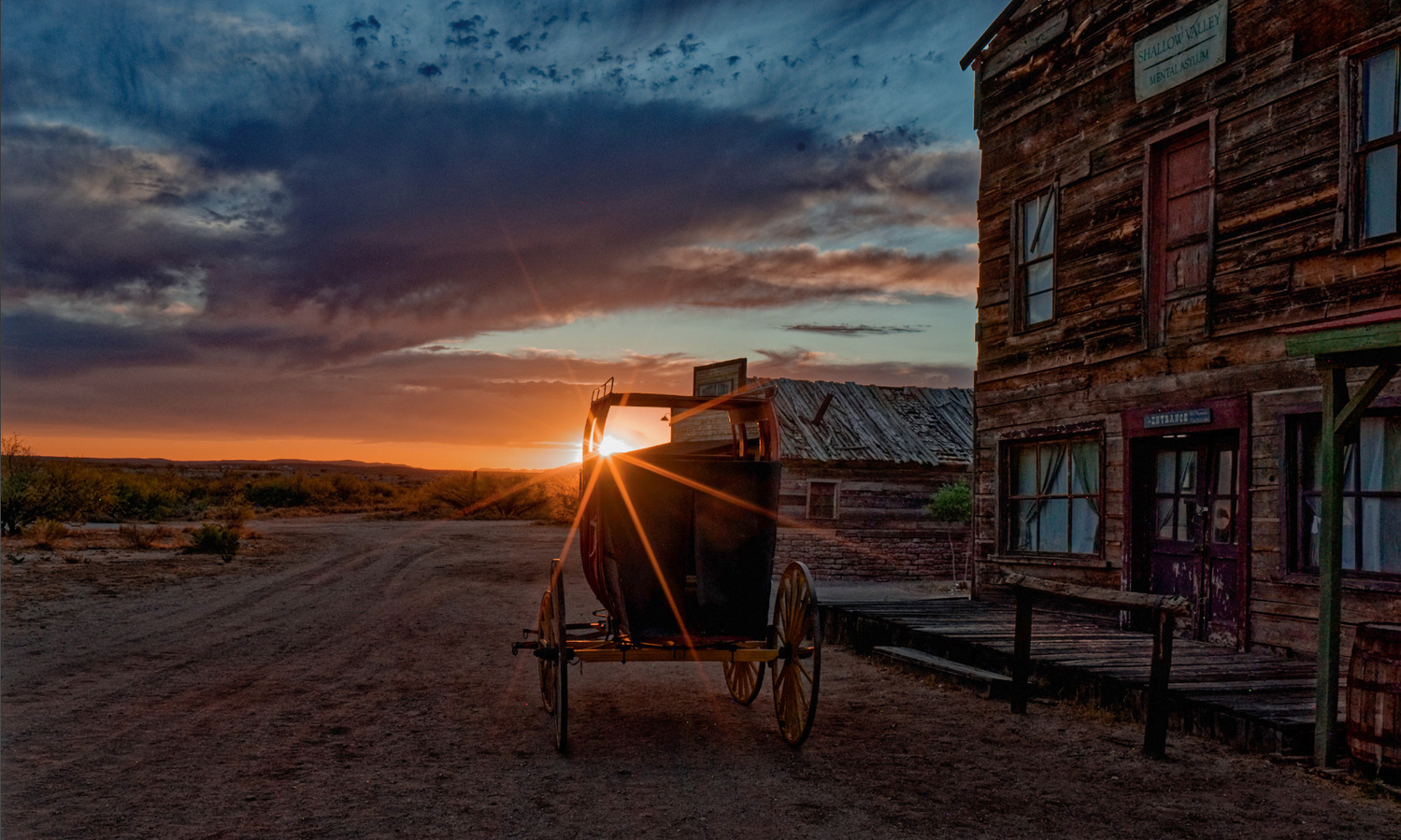 I worked on some images I had taken at the Mescal movie set near Tucson. Many westerns were shot here from the 1950s until the present day. It's a great photo location at sunset when the set is not busy with film production. Mescal is not a well-known tourist stop but worth a visit if you are in Southern Arizona. The fact that it isn't well known means you won't be fighting big crowds to get your images.