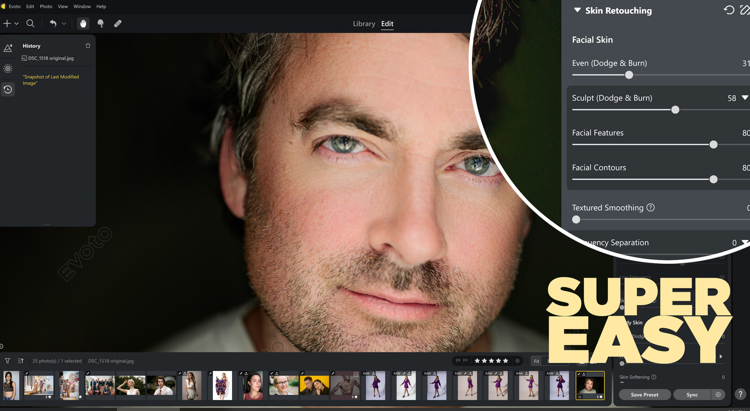 Evoto has two specific sliders, one called Even (dodge and burn) and another called Sculpt (dodge and burn), where you can either create this subtle 3D effect or reduce it and soften the shadows on a person's face. In the above example, I found that the even, flat natural lighting was too soft. By adding a little Sculpt to the model's face, I can bring back some detail without destroying the soft lighting look.