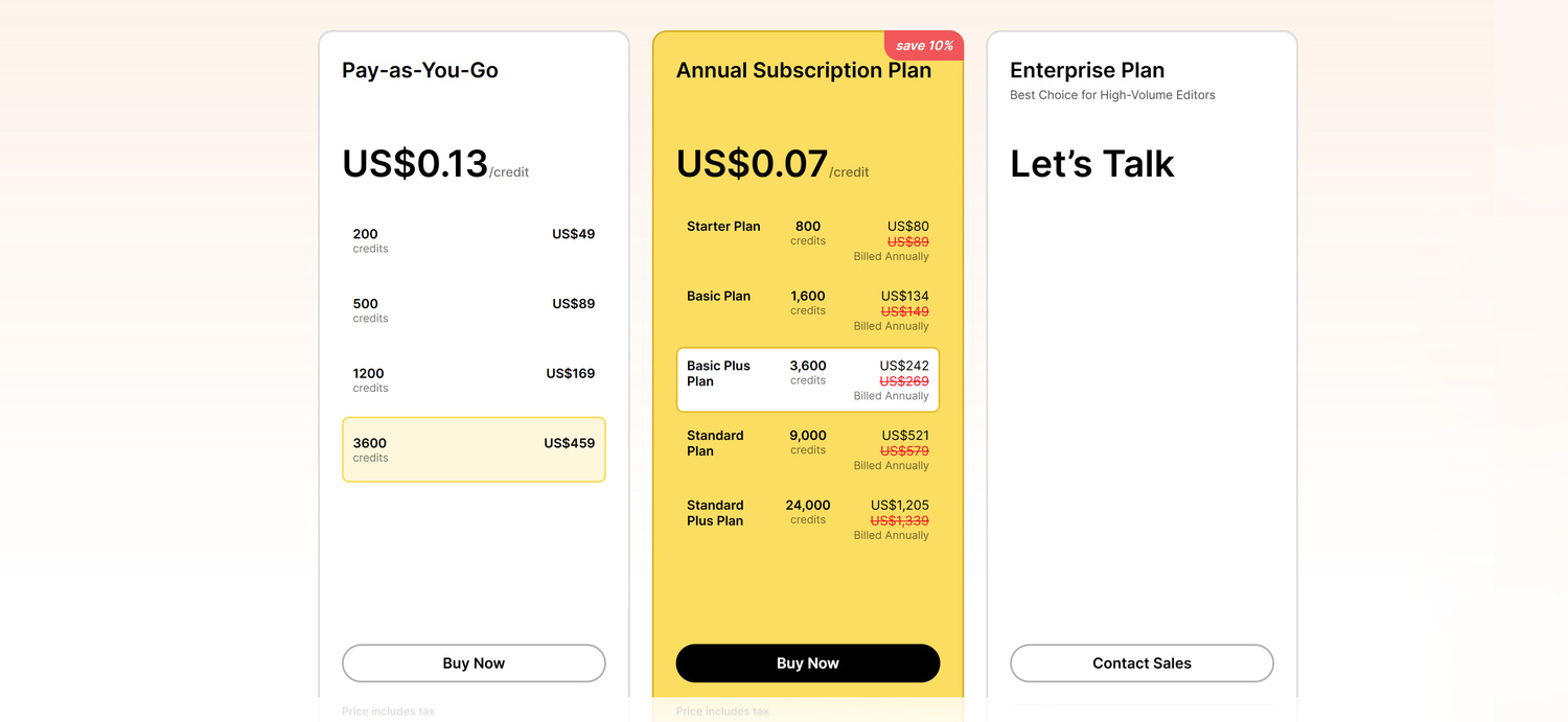 The price per credit under the Pay-as-You-Go option ranges from $0.25 per edit down to $0.13, while the annual subscription lowers these fees to $0.10 per image with the Starter Plan and as low as $0.05 per image with the 24,000-credit Standard Plus Plan.