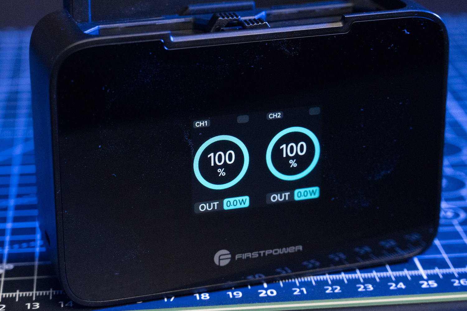 The distinguishing feature of the FirstPower charger is its LCD screen. This display is a significant usability upgrade from the OEM charger experience. Enabled via a power button on the side, or when charging, the screen turns on and displays the charging status for each battery individually, showing a clear percentage of capacity and the real-time wattage being delivered. It shows exactly how much charge you have, and you can even field-check battery levels without needing to swap them into a camera.