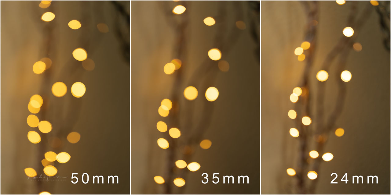 The size of bokeh balls depends on both distance and focal length. The shorter the focal length, the smaller the balls appear. However, in all three cases the balls look smooth, round, and don’t appear to have any onion rings. Towards the corners, the balls take on a cat-eye shape.