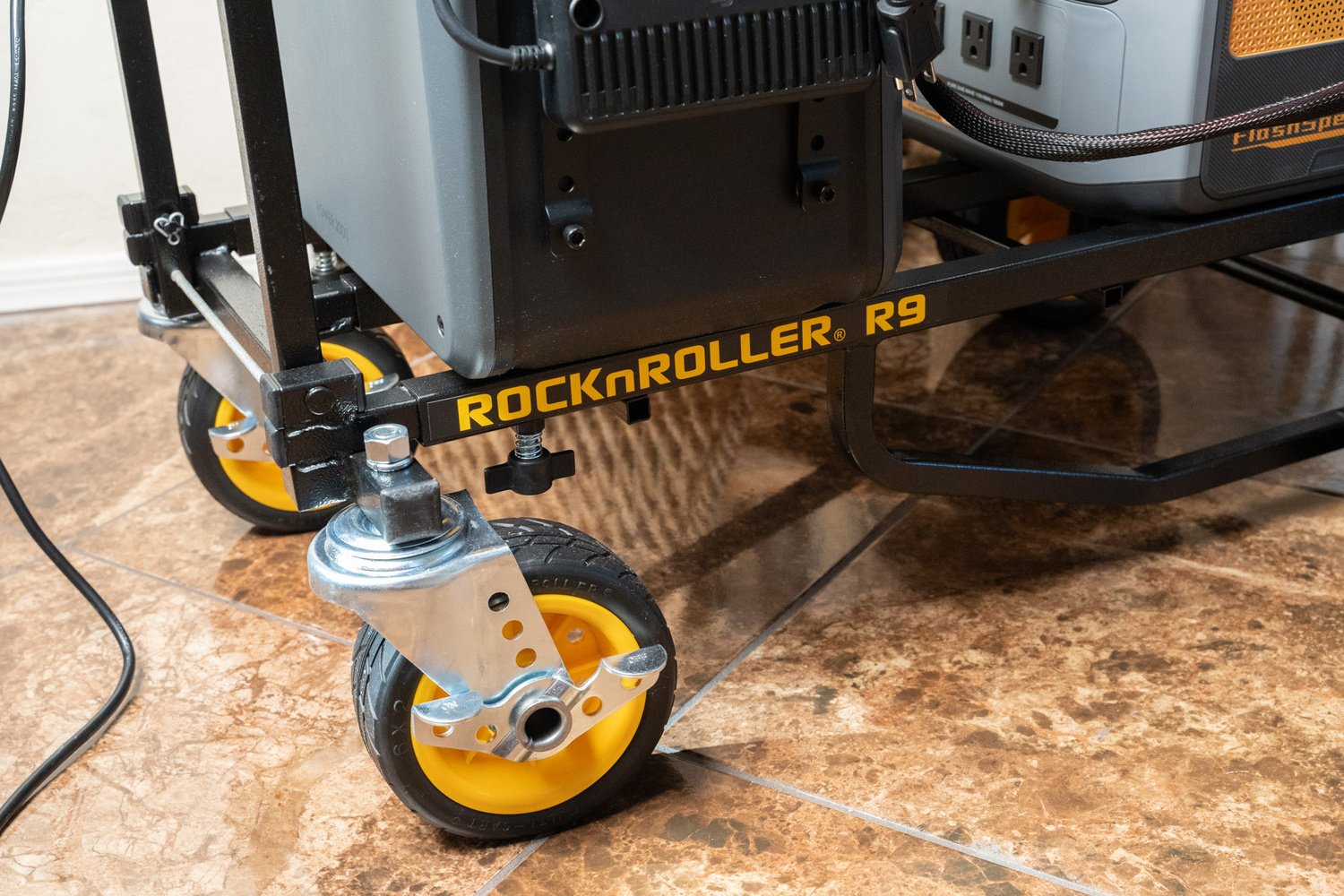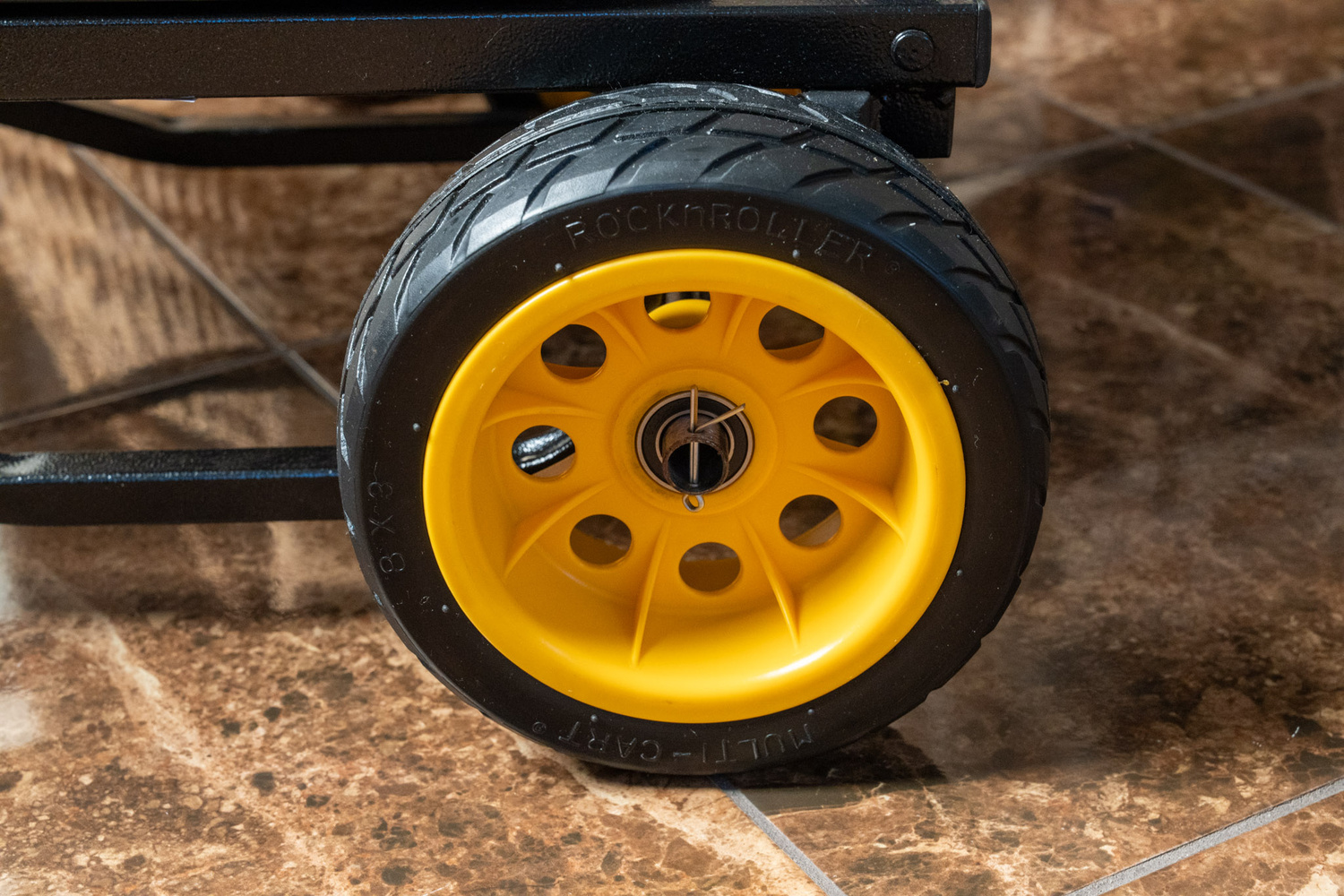 The most critical components for a gear cart are its wheels, and RockNRoller made no compromises. The R9 is outfitted with their wide 6-inch “Groundglider” front swivel casters and beefy fixed 8-inch “Groundglider” rear wheels. The tires are very durable and are “no-flat,” requiring no inflation—that’s really nice for an offroad-focused cart, where an errant cactus spike or thorn could render pneumatic tires useless. The upgraded steel ball bearings help the cart roll smoothly and quietly, even when fully loaded with gear. While I think these parts will all last a long time, RockNRoller also has great replacement part availability through their website in case something breaks.