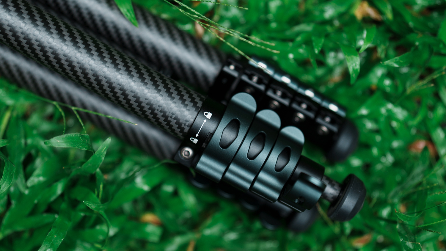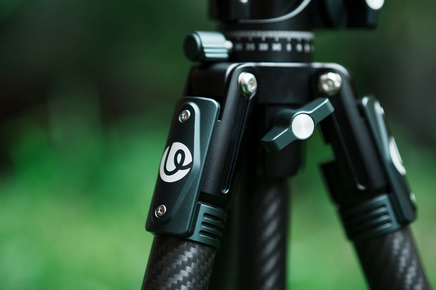 Each of the carbon fiber leg sections is connected by machined aluminum clip locks with a muted dark green color accent. These clip locks are curved to follow the contour of the cylindrical carbon fiber rods for a smoother and more comfortable grip. Atop the most proximal leg section is a leg angle release tab that allows the legs to take a wider configuration for lower angle shooting and/or achieving a broader base.