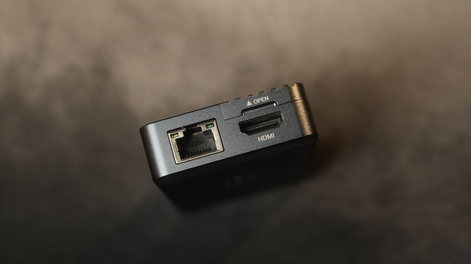 On the opposite short side is an RJ45 gigabit ethernet port that allows wired LAN connection to the host device, even if it does not have a built-in ethernet port. Beside this is a full-sized HDMI port capable of supplying up to 4K60Hz output to a compatible display.
