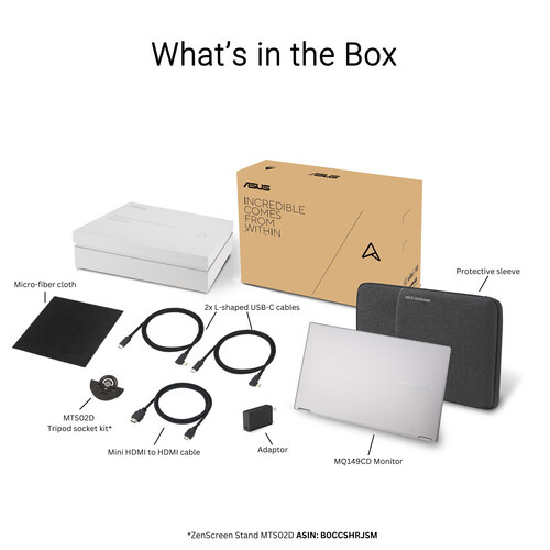 The monitor arrives with everything you need: two USB-C cables, a Mini-HDMI to HDMI cable, a power adapter, and even a tripod mount kit. ASUS includes a microfiber cloth and a protective sleeve too. The sleeve is a particularly nice touch. It's well-padded and fits the folded monitor perfectly, providing real protection during transport without adding bulk. The packaging uses FSC-certified cardboard, which shows nice attention to environmental concerns.